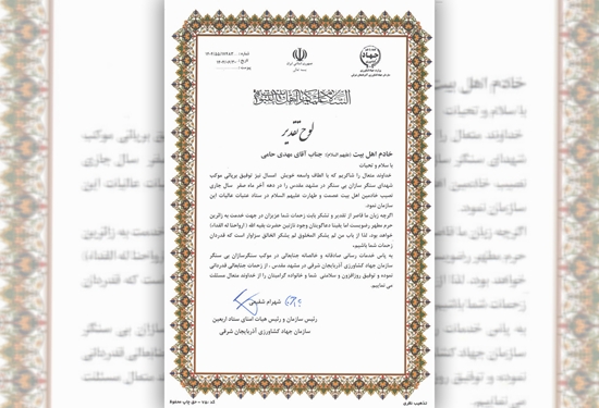 به گزارش روابط عمومی اداره کل دامپزشکی آذربایجان شرقی، با توجه به خدمات ارزشمند و خالصانه مهدی حامی مدیرکل دامپزشکی در برپایی موکب “شهدای سنگرسازان بیسنگر” در مشهد مقدس، لوح تقدیری از سوی شهرام شفیعی رئیس سازمان جهاد کشاورزی آذربایجان شرقی به وی اهدا شد.