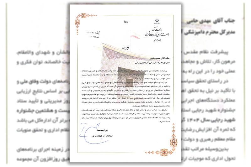تجلیل از مدیرکل دامپزشکی آذربایجان شرقی به عنوان مدیر برتر استانی در جریان ارزیابی عملکرد جشنواره شهید رجایی استان