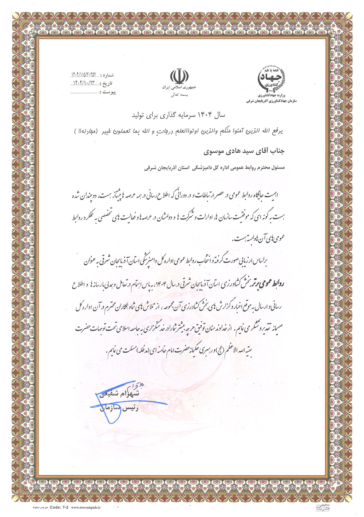 این تقدیر در حضور سید سجاد حسینی رئیس مرکز روابط عمومی و اطلاع رسانی وزارت جهاد کشاورزی، اصغر زارع کهنموئی مدیرکل روابط عمومی استانداری آذربایجان شرقی و مسئولین روابط عمومی سازمان جهاد کشاورزی، ادارات تابعه و شهرستان ها، به عنوان تقدیر از تلاشها و عملکرد روابط عمومی اداره کل دامپزشکی استان در سال 1404 صورت گرفت.